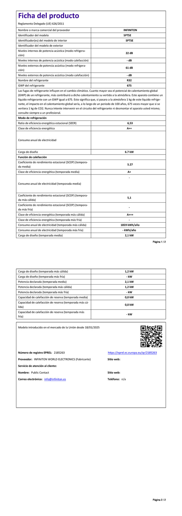 Aire Acondicionado INFINITON SPTSE09A2, 9000 BTU, Wifi, Bomba de Calor, A++, Blanco