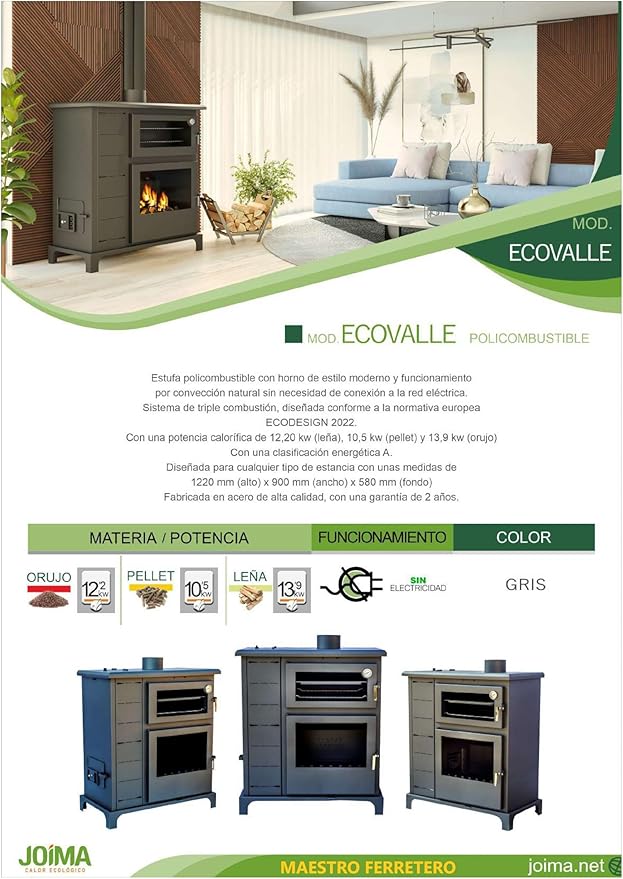 JOIMA - Estufa Policombustible Pellet-orujo-leña con Horno Modelo Eco Valle 12 kW
